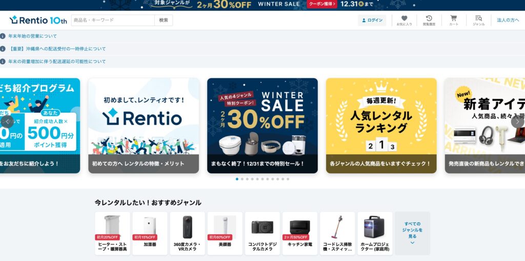 Rentio1000円前後〜3泊〜両方あり最新家電お試し圧倒的な品揃え